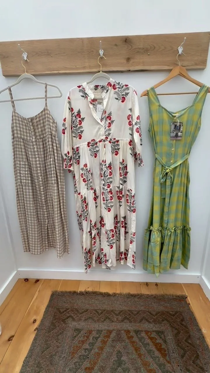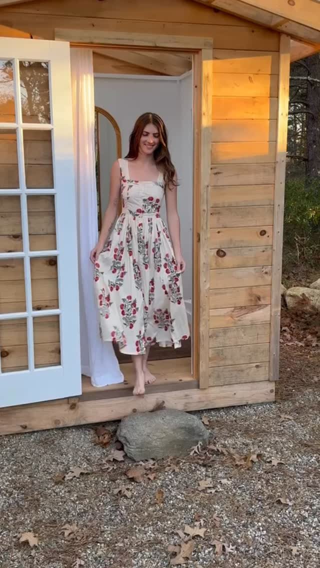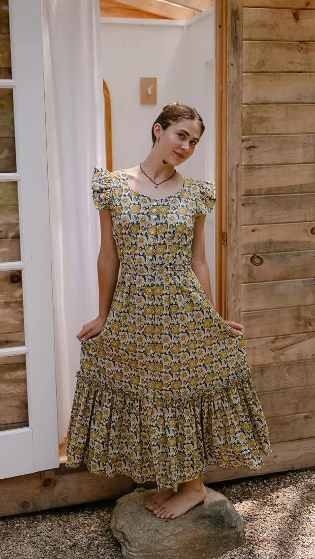 This beautiful dress features a minimal puff sleeve and a smocked top, creating a feminine and flattering silhouette. The dress falls to a midi length, making it perfect for both casual and dressy occasions. It is made out of block print cotton, which gives it a unique and eye-catching pattern. The short sleeves make it ideal for warmer weather, while the smocking ensures a comfortable and flexible fit. Overall, this dress is both stylish and practical, making it a versatile addition to any wardrobe.